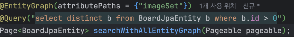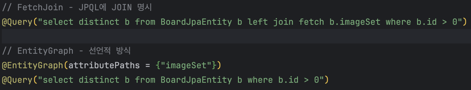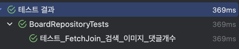 FetchJoin의 COUNT 쿼리는 left join board_image를 포함하지만, EntityGraph의 COUNT 쿼리는 board 테이블만 조회해요.