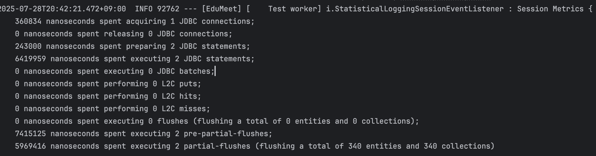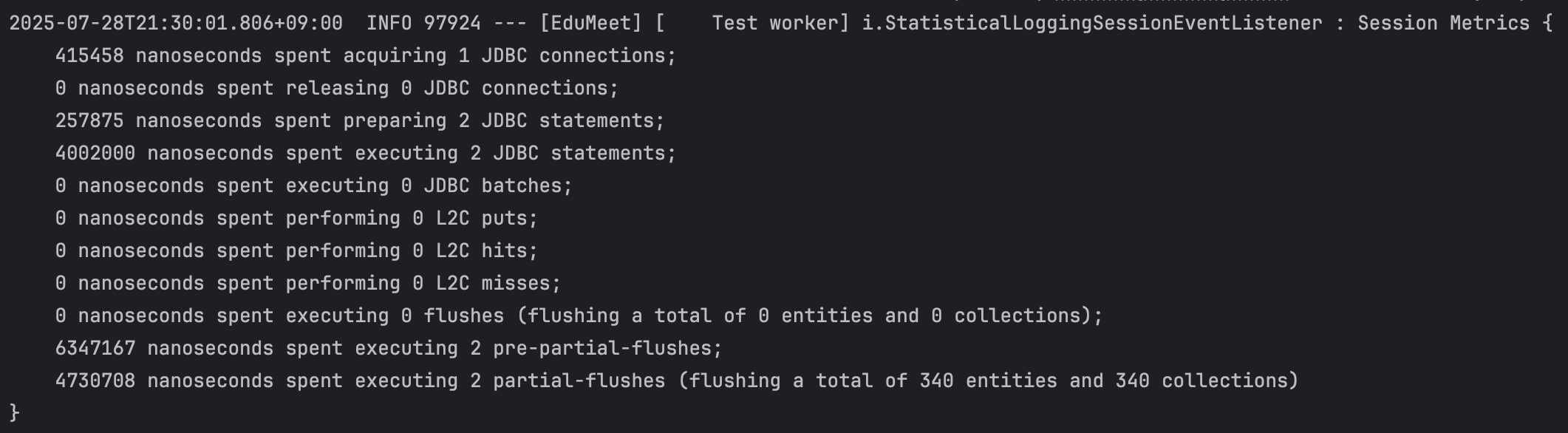 각 전략의 실제 성능을 비교하기 위해 Hibernate 통계 기능을 활성화했어요.
