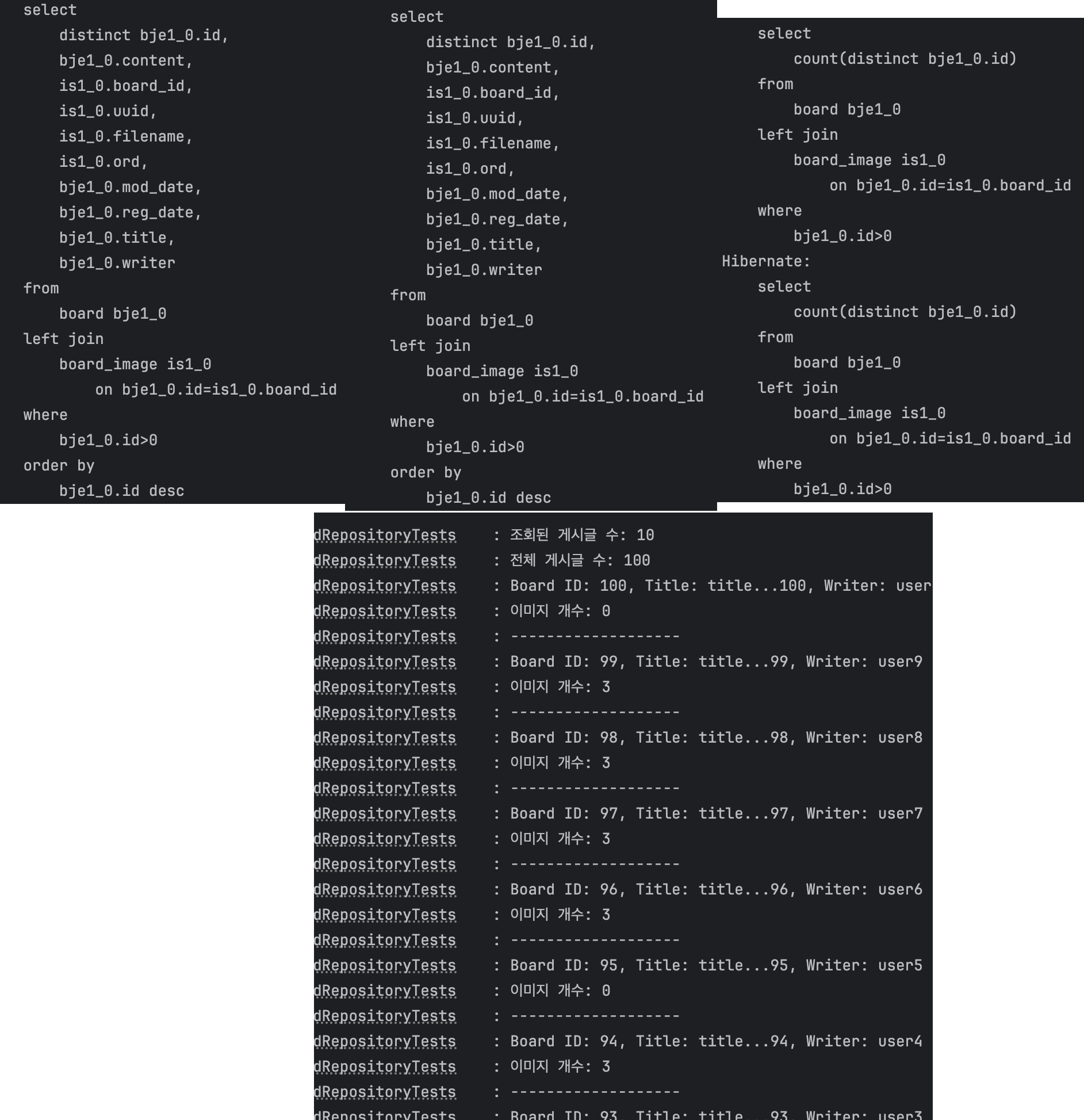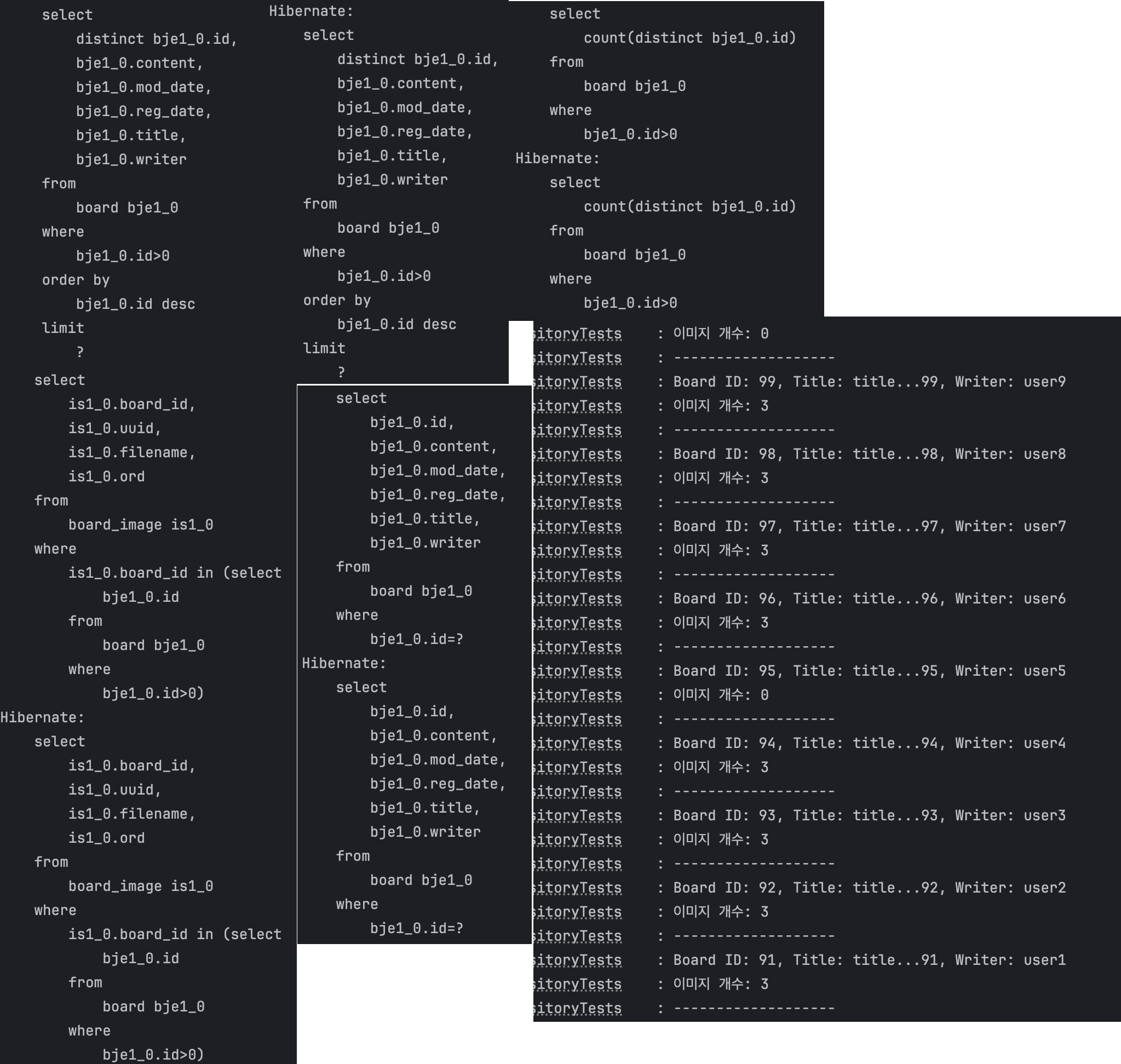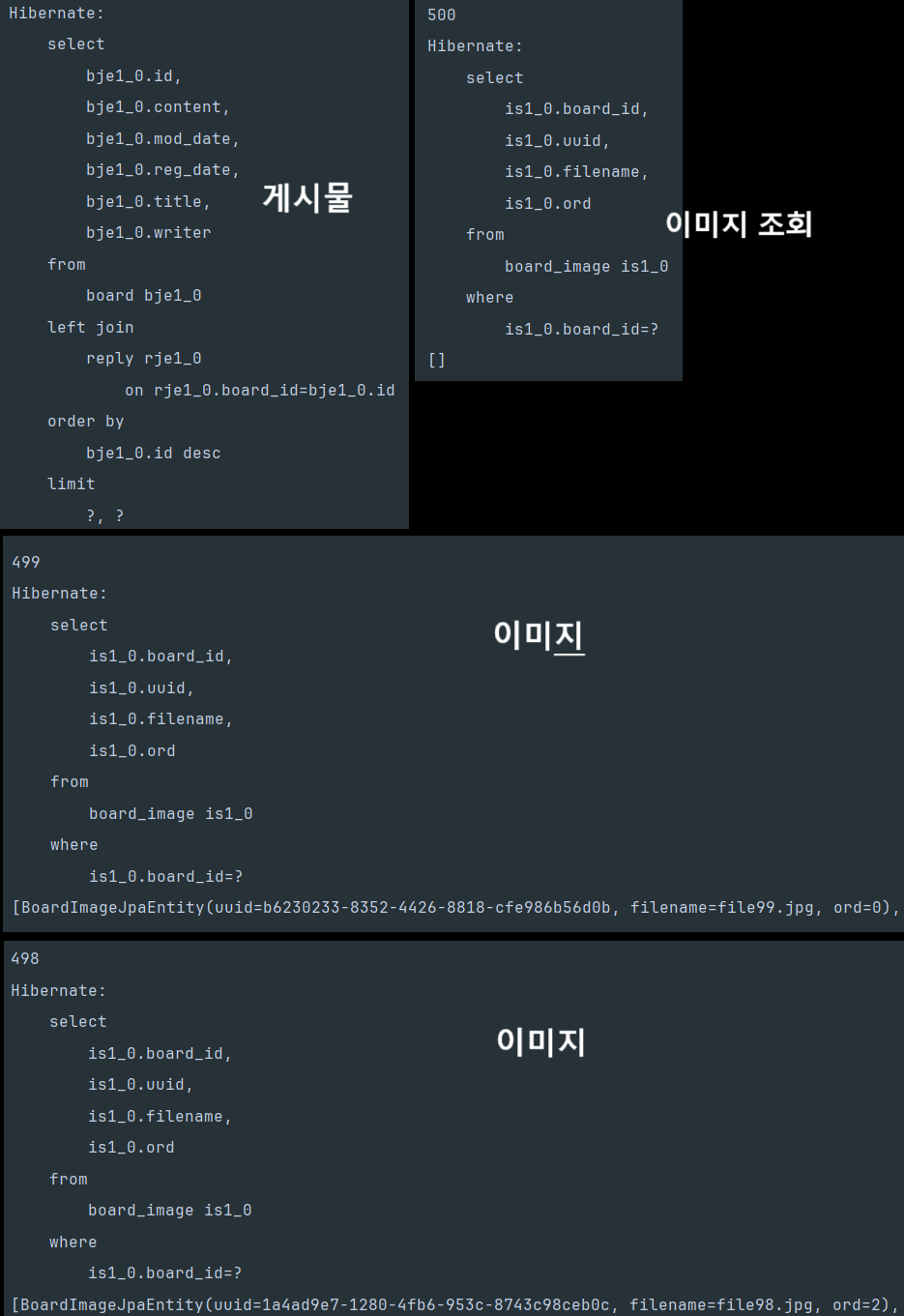 실행된 쿼리 로그를 확인해보니, 목록을 가져오는 쿼리 1건 외에 각 게시글마다 board_image를 조회하는 쿼리가 개별 실행되고 있었어요.