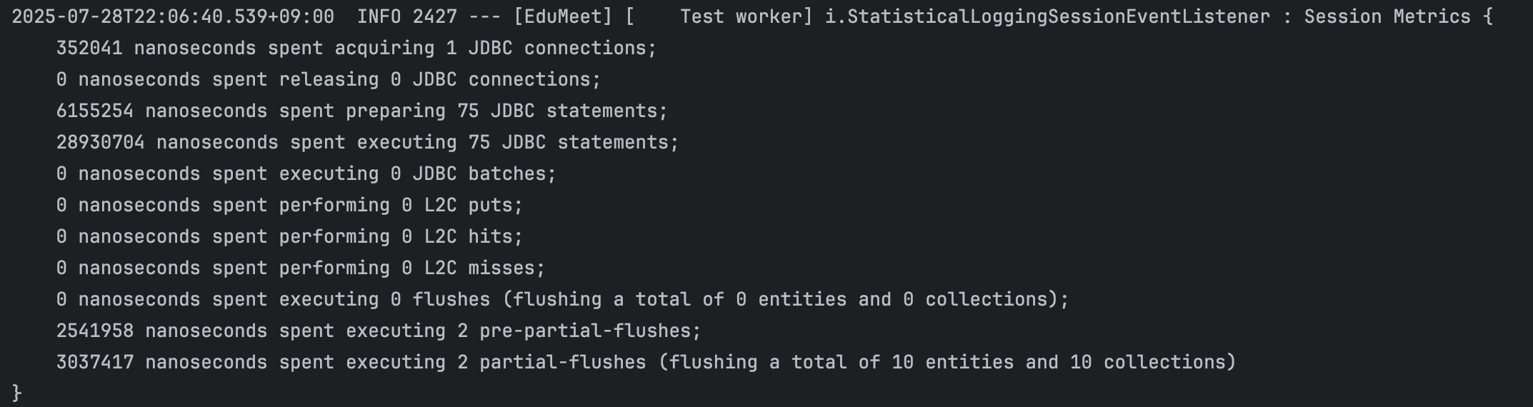 기대와 달리 쿼리가 대량으로 실행됐어요. 총 75개의 JDBC statements가 실행됐어요.