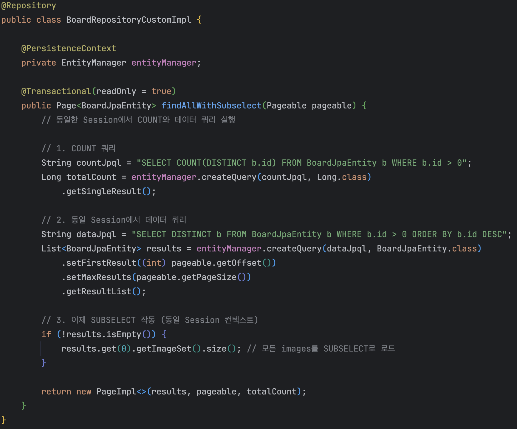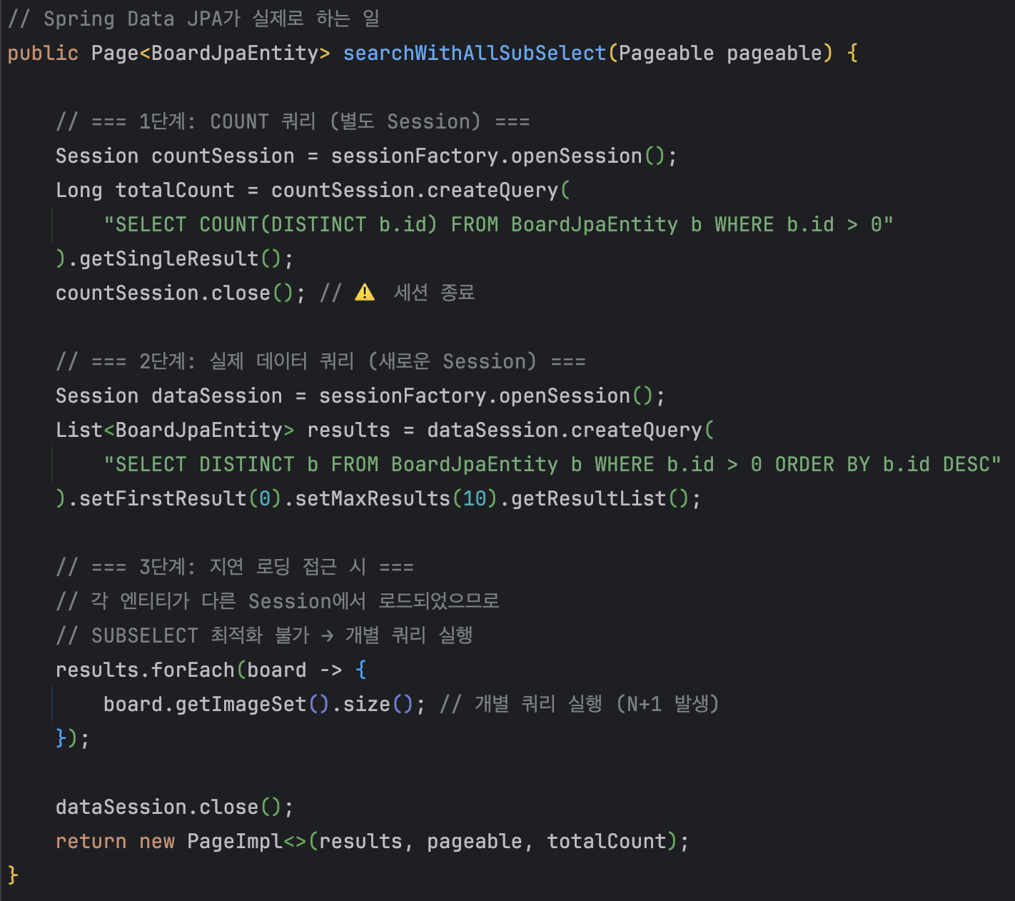 결론: SUBSELECT는 Spring Data JPA의 페이징 처리 방식과 근본적으로 호환되지 않아요.