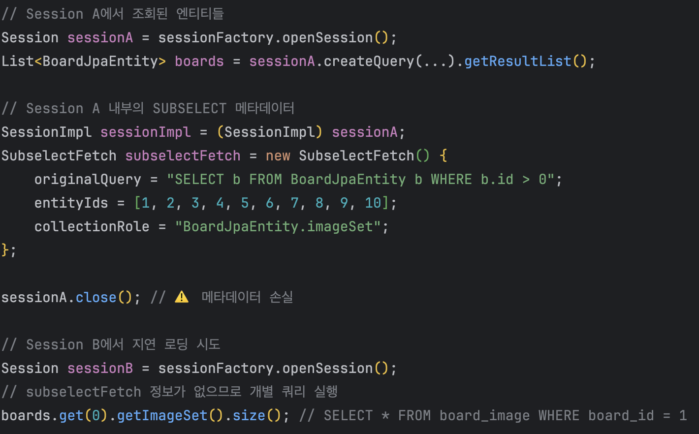 첫 번째 쿼리로 부모 엔티티를 조회한 후, 두 번째 쿼리에서 서브쿼리를 사용하여 연관된 모든 자식 엔티티를 한 번에 조회하는 방식이에요.