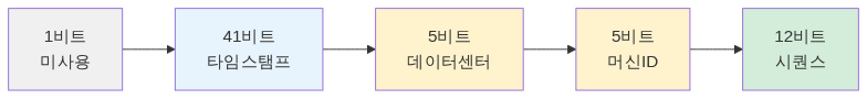 Twitter가 만든 Snowflake ID는 64비트로 순차성과 분산 환경을 모두 지원해요.