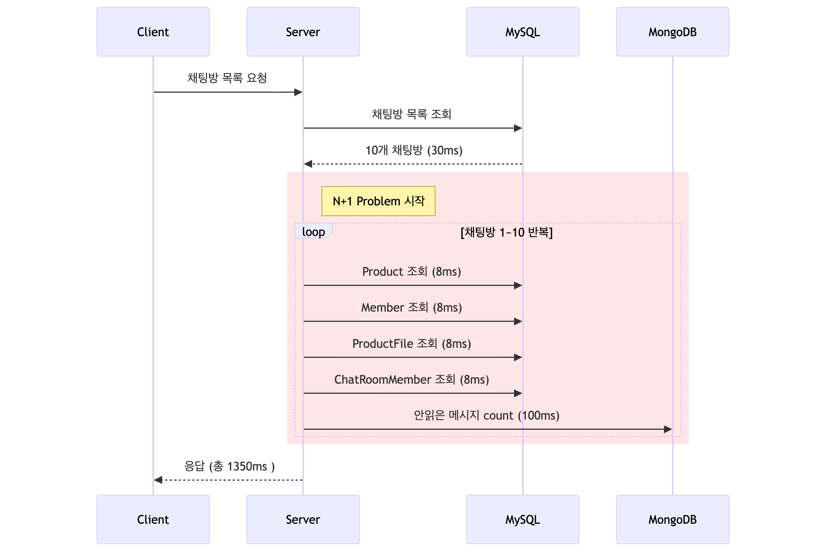 핵심 문제는 N+1 Query였어요. 채팅방 N개에 대해 여러 종류의 추가 쿼리가 발생했습니다.
