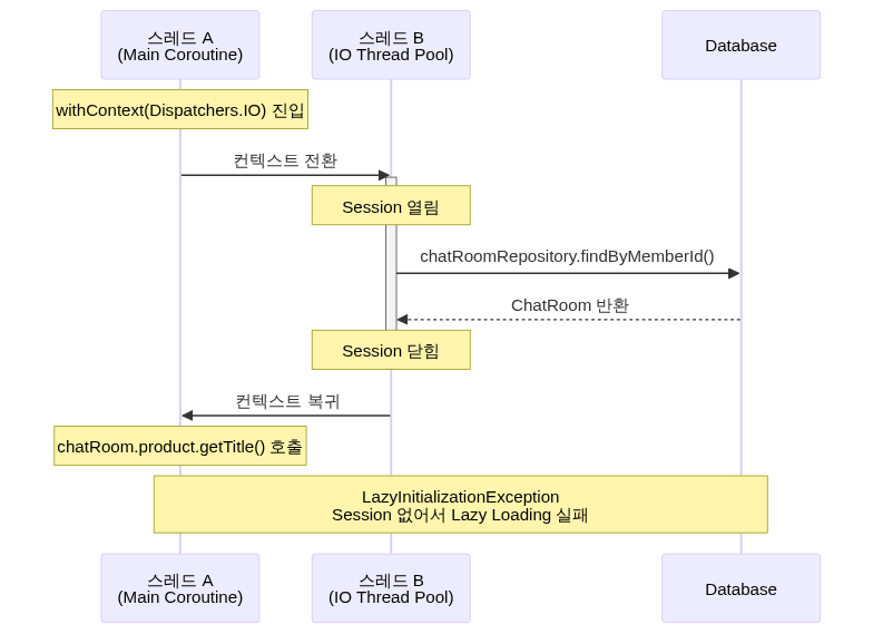 Kotlin Coroutine의 withContext(Dispatchers.IO)는 스레드를 전환해요. Hibernate Session은 스레드 로컬에 바인딩되어 있어서, withContext 블록을 벗어나면 Session이 종료됩니다.
