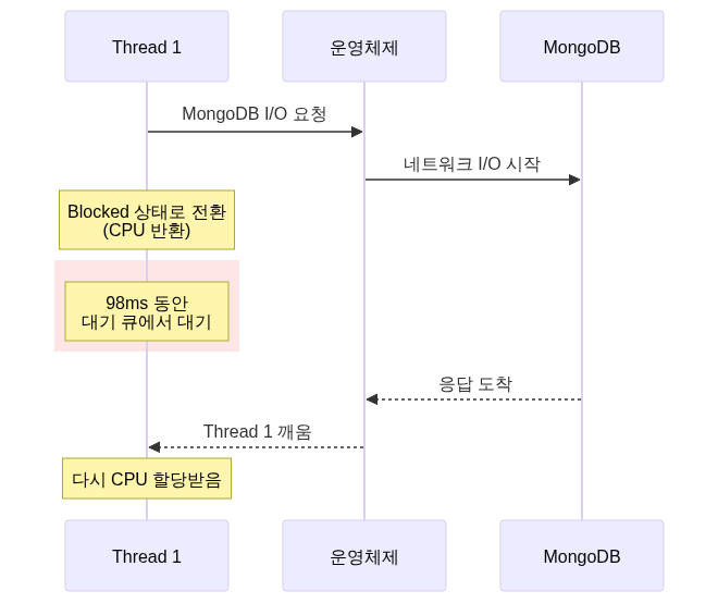 - MongoDB 서버 응답 대기 (98ms) ← CPU 안 씀