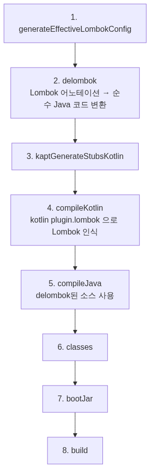 Kotlin 컴파일 (2단계) → Java annotation processing (3단계) → Java 컴파일 (4단계)Kotlin이 먼저 컴파일되는데, 그 시점에는 Lombok이 getter를 아직 생성하지 않았어요. 그래서 Kotlin이 Java Lombok getter를 찾지 못하는 거예요.