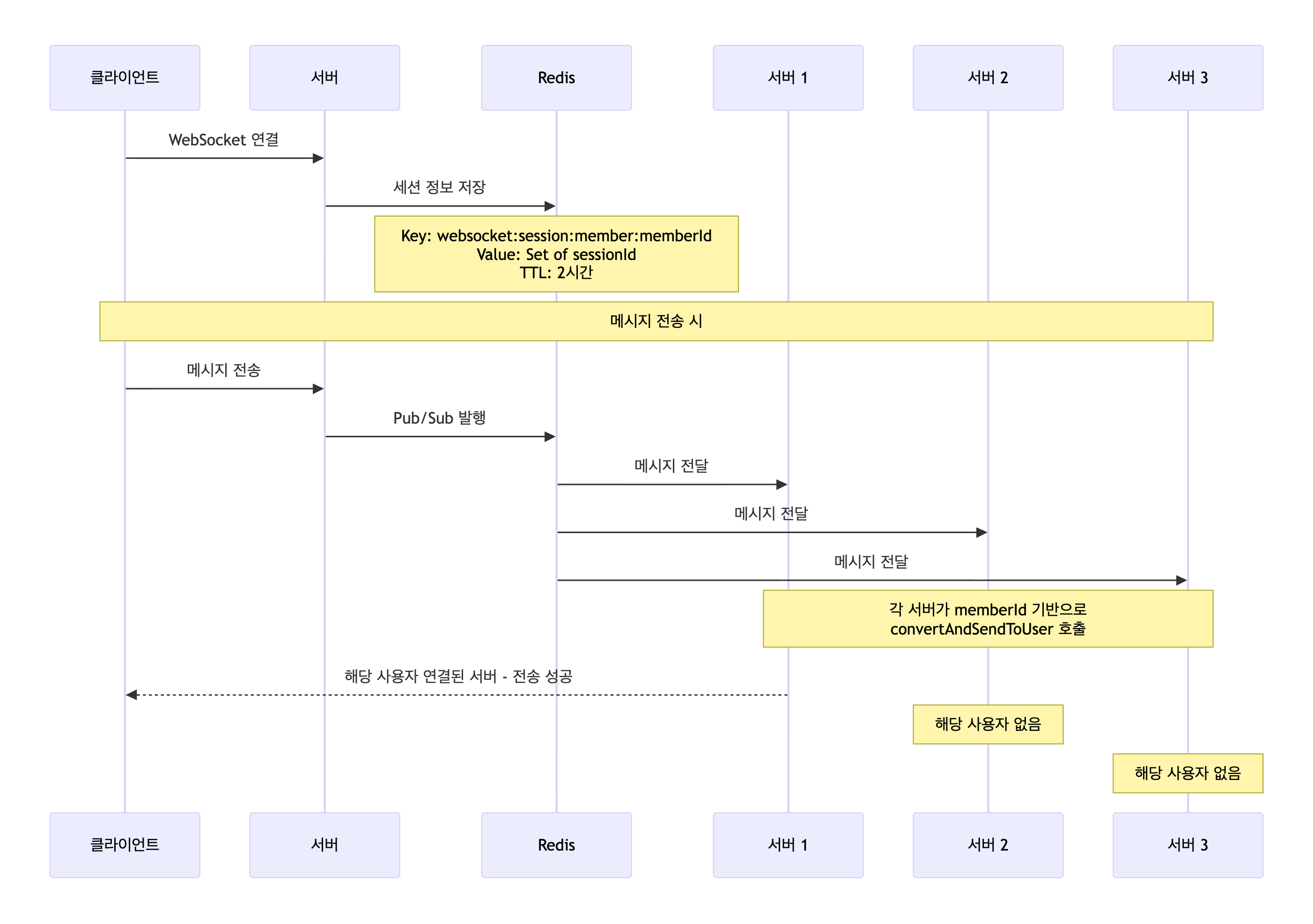 [서버 1: userA 연결] Redis Pub/Sub 수신 -> convertAndSendToUser(“userA”) -> 성공 -> convertAndSendToUser(“userB”) -> 실패 (연결 없음)