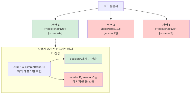 [서버 1] SimpleBroker 메모리: { “/topic/chat/123”: [sessionA] } -> 메시지 발행 -> sessionA에게만 전송 (다른 서버의 세션은 못 받음)