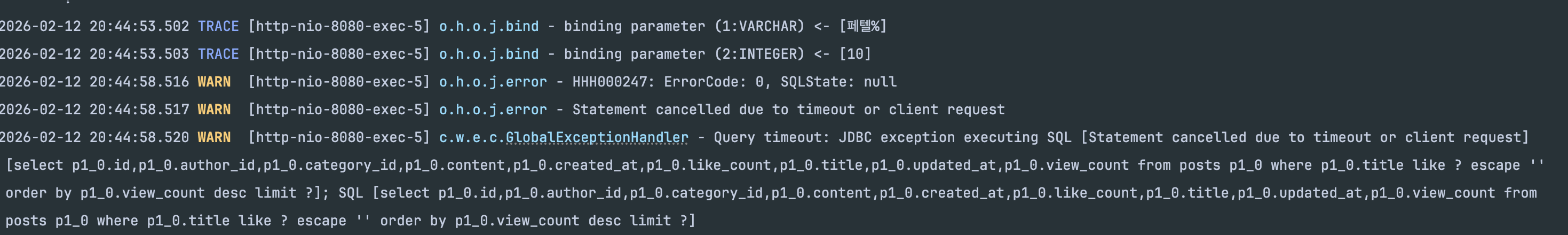 검색은 여전히 타임아웃으로 실패하지만, 자동완성(LIKE 'prefix%')은 후방 와일드카드이므로 B-Tree 인덱스를 활용할 수 있을 것이라 예상했습니다.