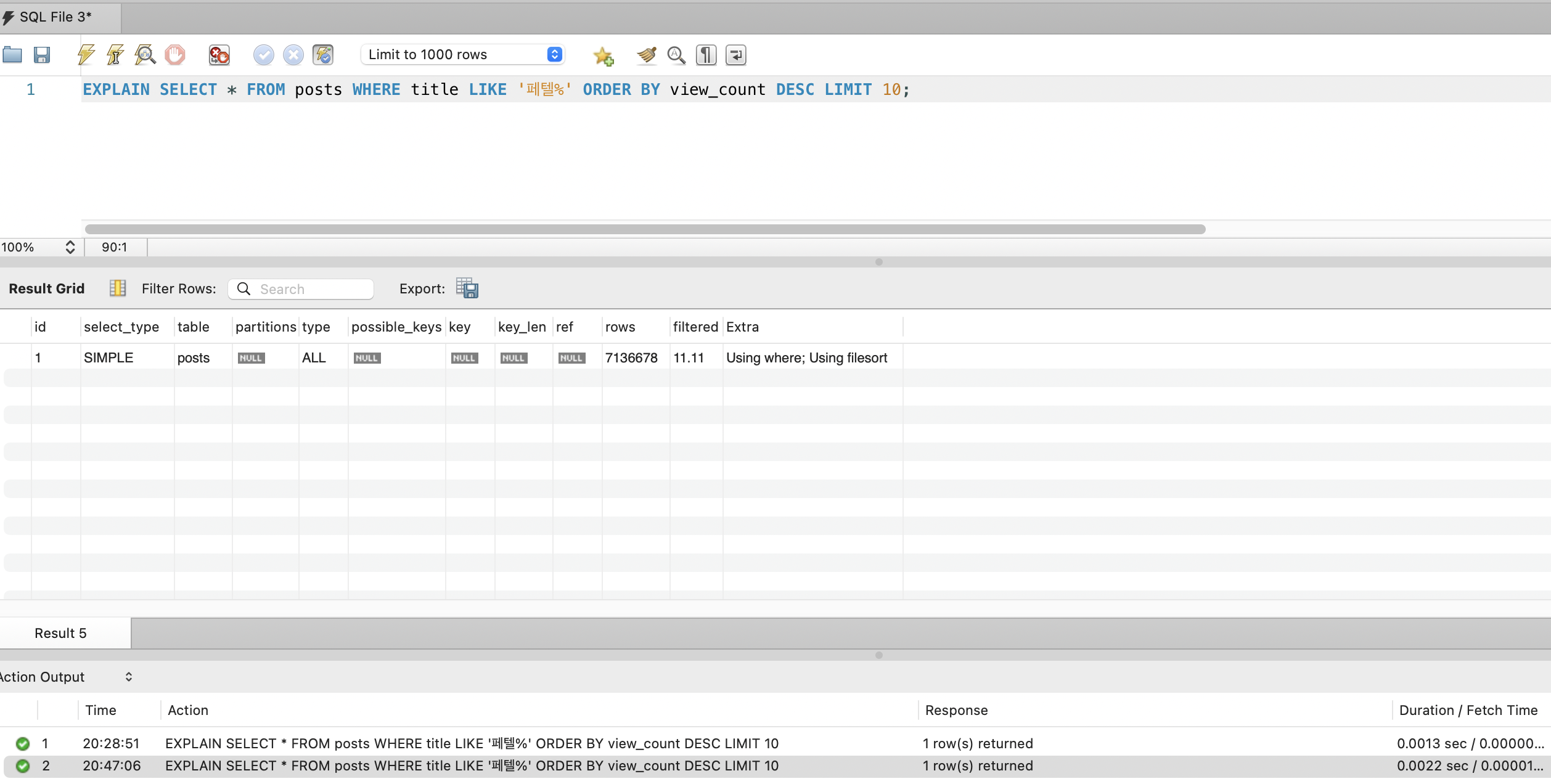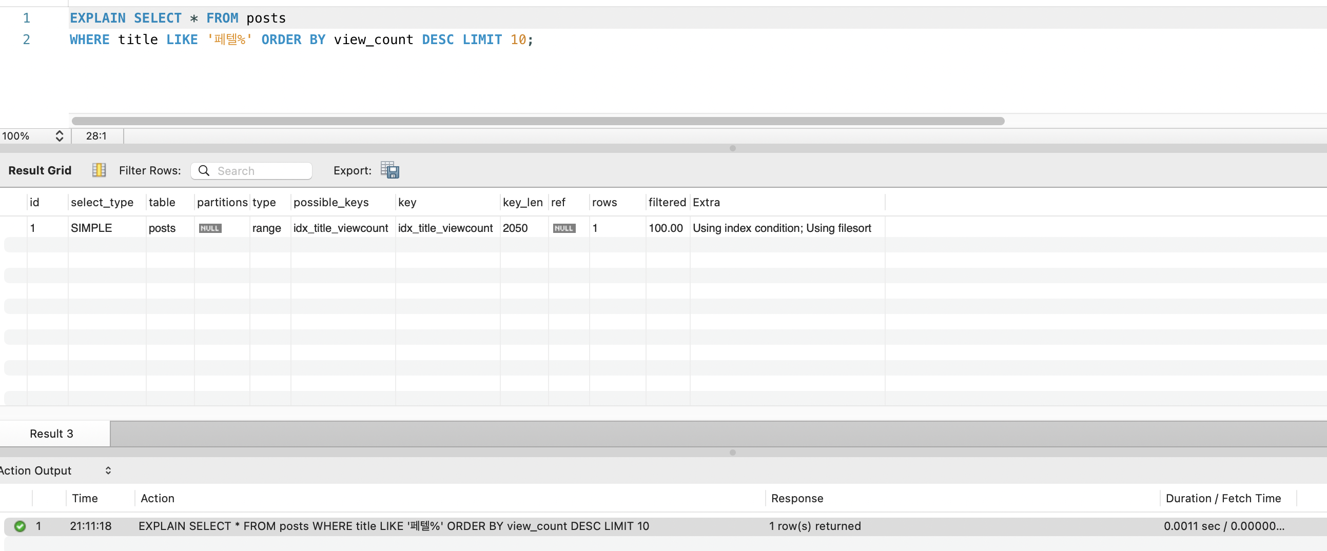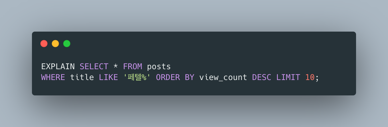 단일 인덱스만 있으면 WHERE title LIKE 'prefix%'에서 range scan은 가능하지만, ORDER BY view_count DESC에서 filesort가 발생합니다. MySQL은 인덱스에서 prefix에 매칭되는 모든 행을 가져온 뒤, 메모리(또는 디스크)에서 view_count로 재정렬해야 합니다.