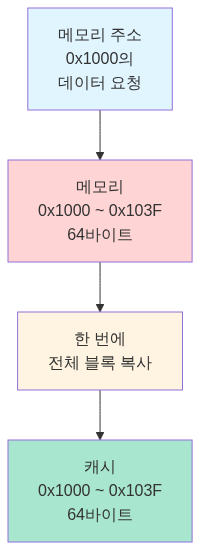 캐시 라인 (Cache Line): 캐시는 데이터를 개별 바이트가 아닌 블록 단위로 가져와요. 일반적으로 64바이트 단위의 캐시 라인을 사용합니다.