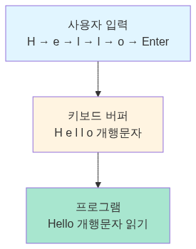 사용자 입력: H → e → l → l → o [Enter] ↓키보드 버퍼: [H][e][l][l][o][\n] ↓프로그램: "Hello\n" 읽기키보드 버퍼가 없다면, 프로그램이 입력을 읽기 전에 사용자가 누른 키가 손실될 수 있어요.