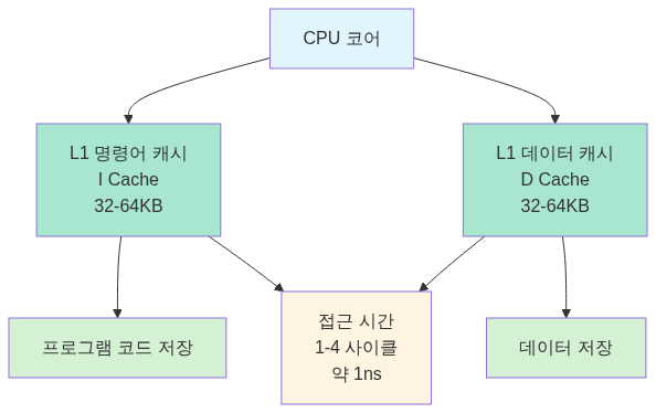 CPU 코어에 가장 가까운 캐시로, 명령어 캐시(I-Cache)와 데이터 캐시(D-Cache)로 분리되어 있어요.