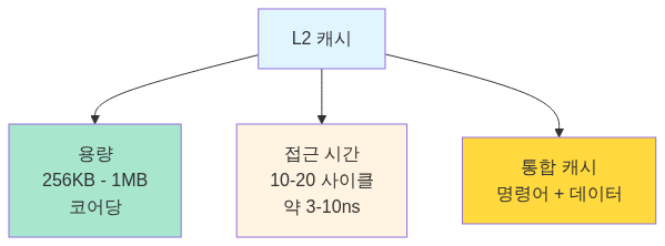 L1 캐시보다 크지만 약간 느린 캐시예요. 보통 각 CPU 코어마다 독립적으로 존재합니다.