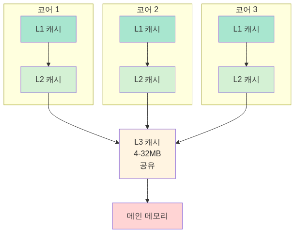 모든 CPU 코어가 공유하는 캐시예요. 가장 크지만 L1, L2보다 느립니다.