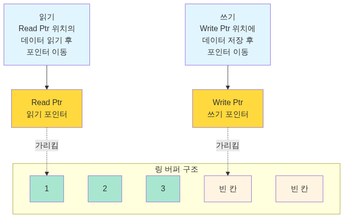 링 버퍼는 포인터가 끝에 도달하면 처음으로 돌아가므로, 메모리를 재활용할 수 있습니다.
