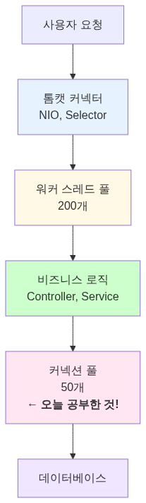 스레드 풀에 대해 공부하고 개념을 재정립 했는데, 자연스럽게 또 다른 의문이 생겼어요. “그럼 DB 커넥션은 어떻게 관리되는 거지?” 스레드 풀이 200개로 제한되어 있다면, DB 커넥션도 제한이 있을 것 같았거든요. 그래서 DB 커넥션 풀에 대해 파헤쳐 보기로 했어요.