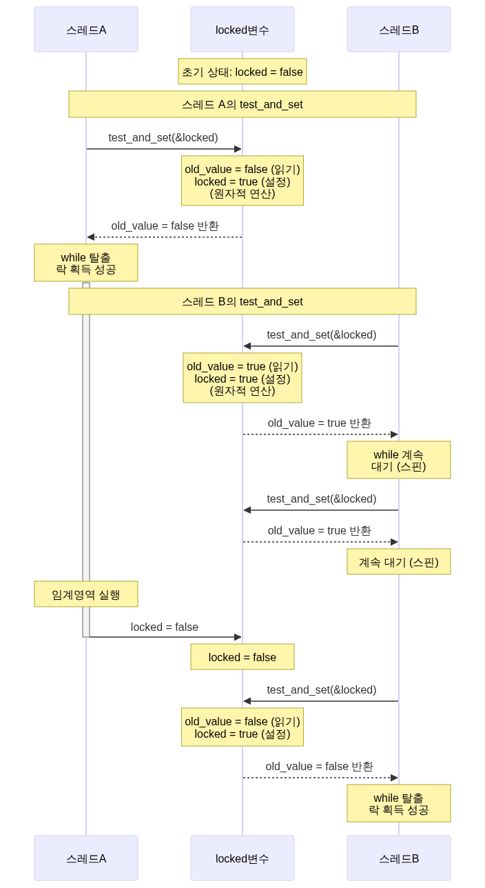 void lock() { // old_value가 false일 때까지 반복 (락 획득 성공) while (test_and_set(&locked)) { // 바쁜 대기 (busy waiting) } }