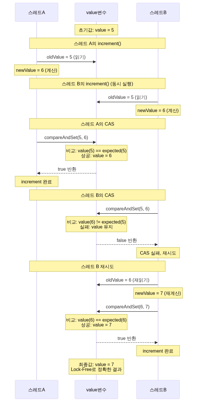 public void increment() { int oldValue, newValue; do { oldValue = value.get(); newValue = oldValue + 1; } while (!value.compareAndSet(oldValue, newValue)); // CAS 실패 시 재시도 (낙관적 접근) }}동작 과정: