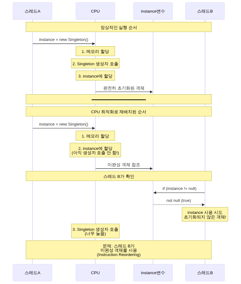 // 잘못된 구현 (Double-Checked Locking 문제) public static Singleton getInstance() { if (instance == null) { // 1. 첫 번째 체크 synchronized (Singleton.class) { if (instance == null) { // 2. 두 번째 체크 instance = new Singleton(); // 문제 발생 지점! } } } return instance; }}문제점: