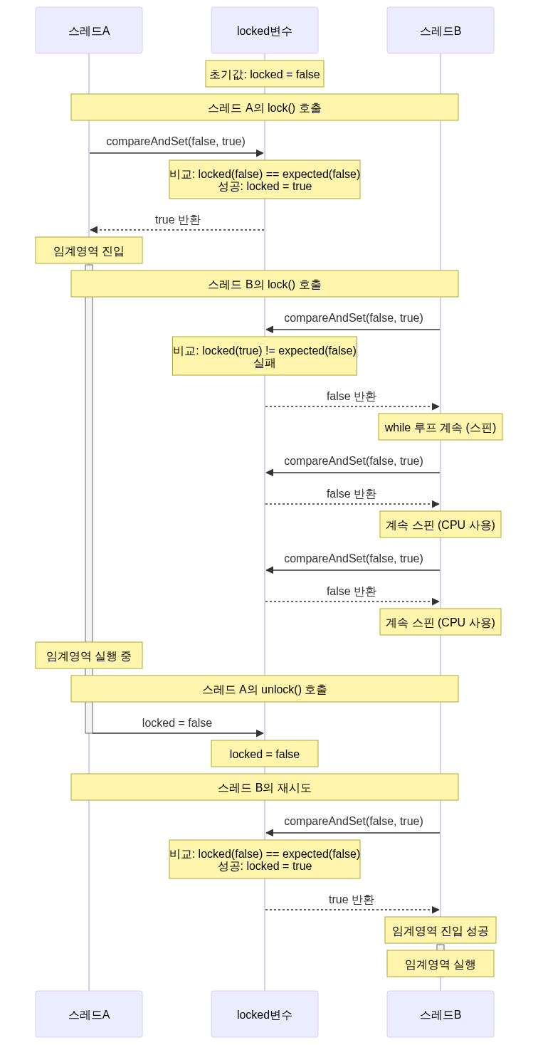 public void lock() { // 락을 획득할 때까지 계속 시도 (바쁜 대기) while (!locked.compareAndSet(false, true)) { // CPU를 계속 사용하면서 대기! } }