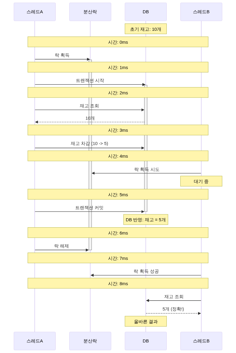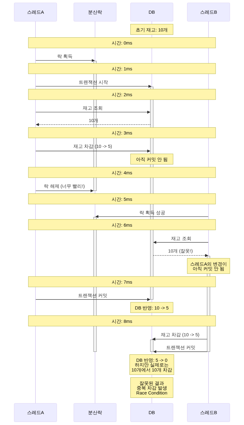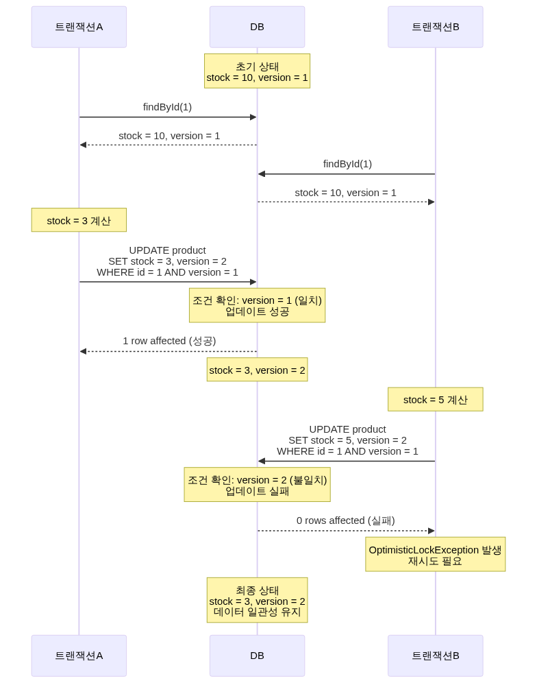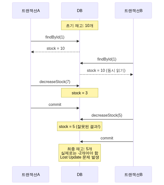 if (product.getStock() >= quantity) { product.decreaseStock(quantity); // 여러 트랜잭션이 동시 실행 가능! productRepository.save(product); } }
