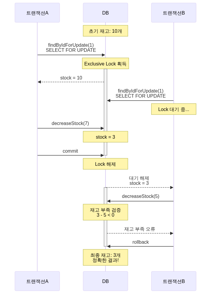 public void createOrderCorrect(Long productId, int quantity) { // Exclusive Lock으로 다른 트랜잭션 차단 Product product = productRepository.findByIdForUpdate(productId);