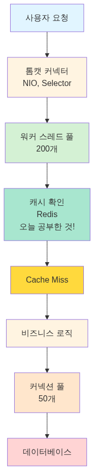 1초 동안의 처리:- 요청 500개- DB 쿼리 500번 (각 10ms)- 총 DB 시간: 5000ms (5초!)- 커넥션 풀 고갈 위험