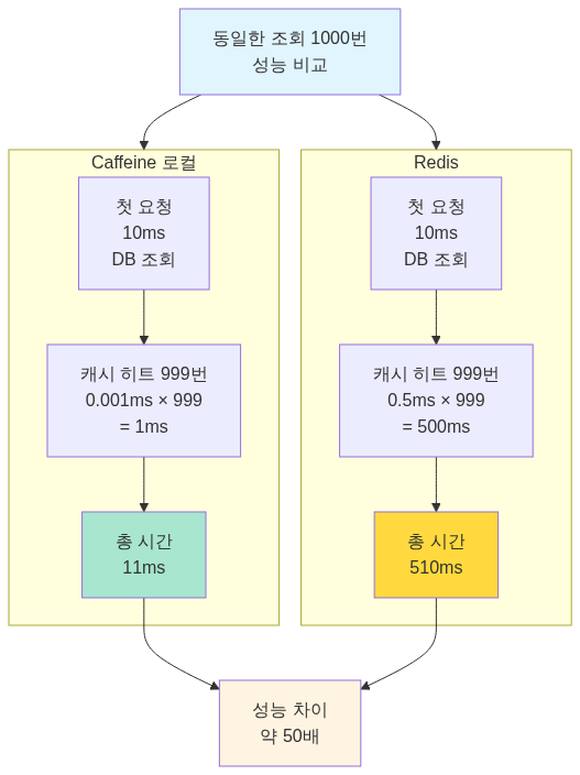 캐시 적용 후:- 첫 번째 요청: DB 조회 (10ms) + 캐시 저장- 2~500번째 요청: 캐시 조회 (0.01ms)- 총 시간: 10ms + (499 × 0.01ms) = 15ms- 성능 향상: 약 333배!1.3 CPU 캐시에서 배우는 교훈