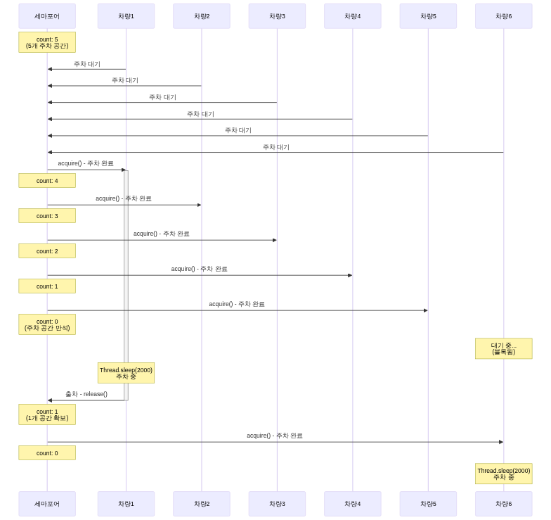 // 카운팅 세마포어 예시: 주차장 (5개의 주차 공간)Semaphore parkingLot = new Semaphore(5);