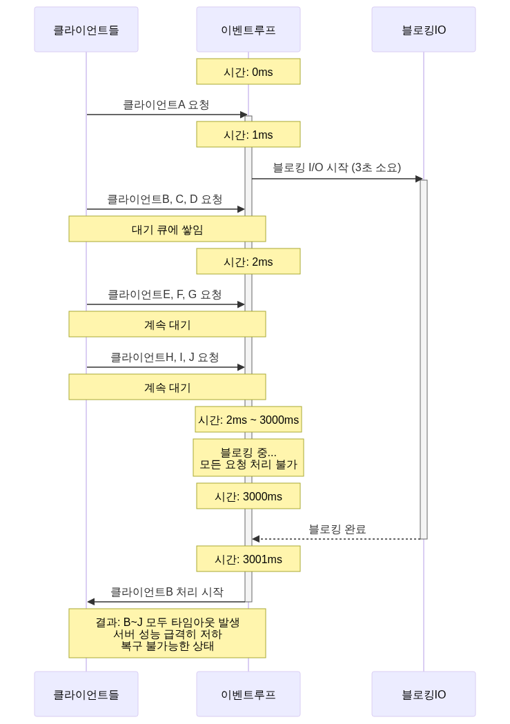 Performing a blocking operation on the event loop thread freezes the entire server.