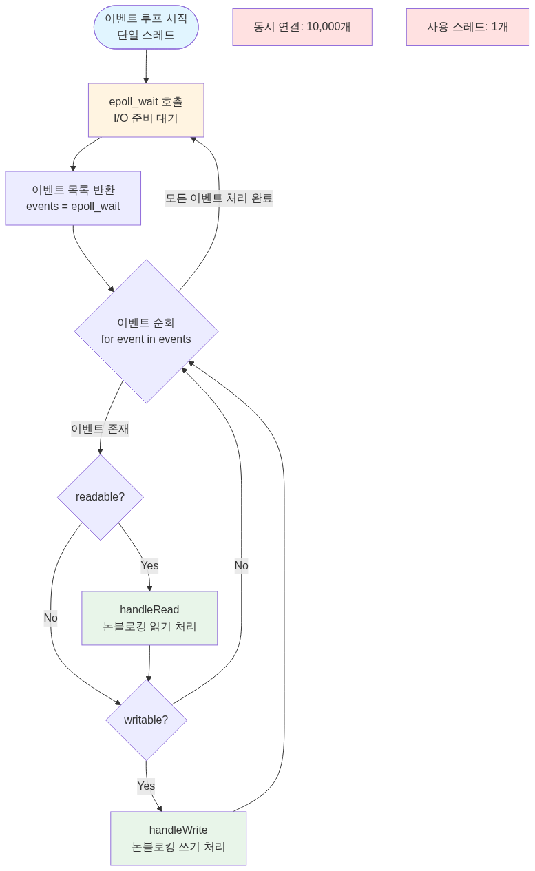 while (true) { events = epoll_wait() // <- Wait for I/O readiness