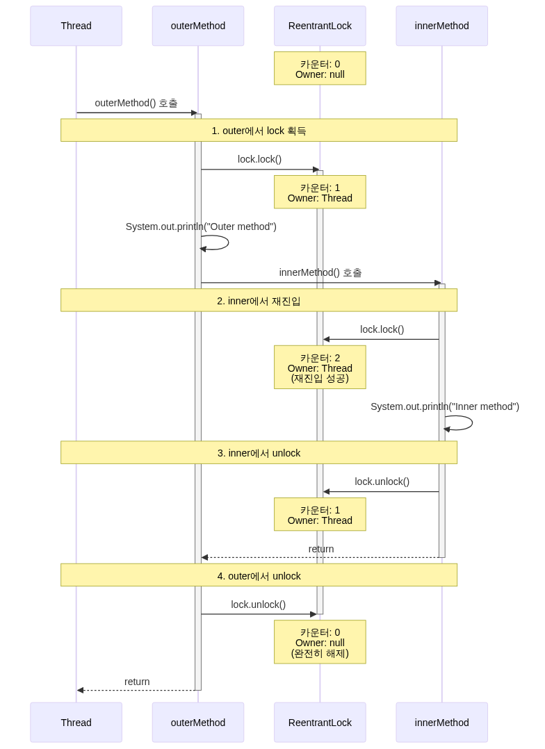 public void outerMethod() { lock.lock(); try { System.out.println("Outer method"); innerMethod(); // 같은 스레드가 lock을 다시 요청 } finally { lock.unlock(); }}