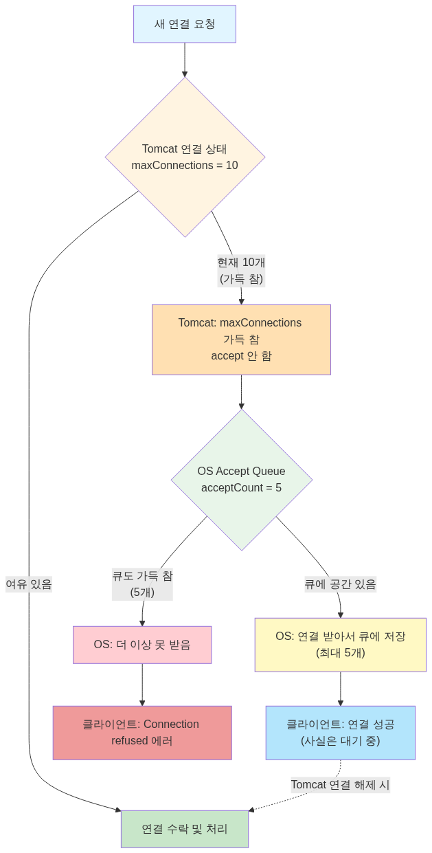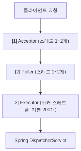 // After (NIO): 1000개 연결 = Poller 1~2개 + 필요할 때만 워커 스레드// 메모리: 2MB (Poller) + 동적 할당출처: px201226.github.io - Apache Tomcat 이해하기(NIO Connector 중심)