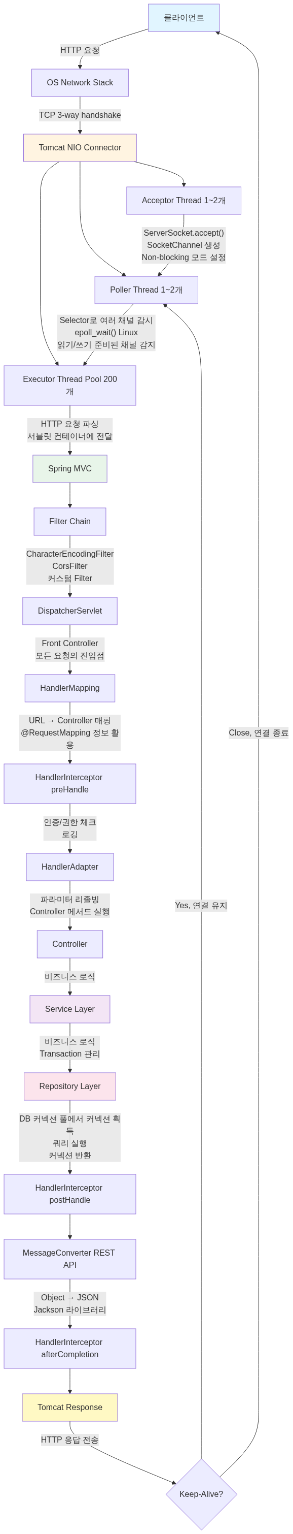 After studying everything from Tomcat Connectors to Spring MVC, the full picture of how a single request is processed is now clear.