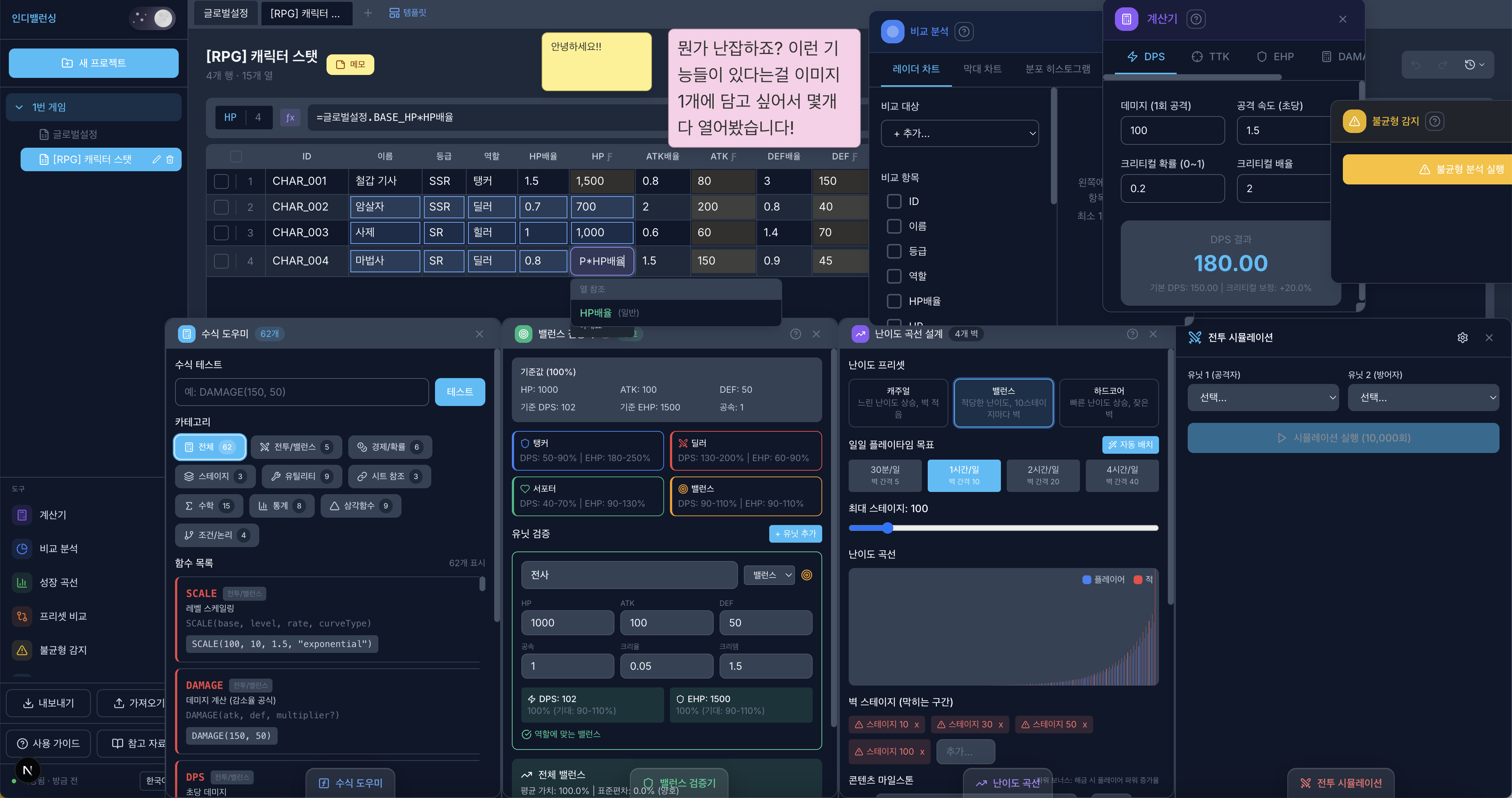 MVP로 공개한 인디밸런싱의 계산기, 성장곡선, 전투 시뮬레이션, 밸런스 분석 등 15가지 핵심 기능을 소개해요.