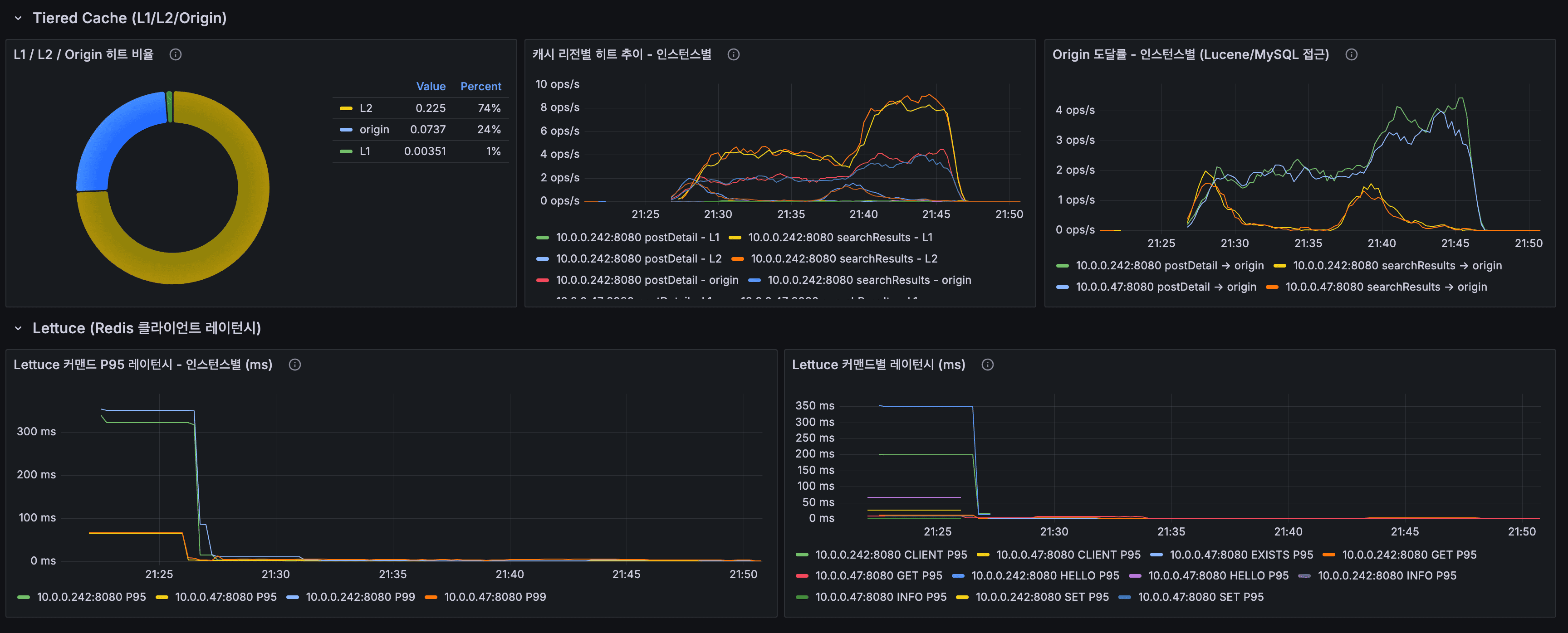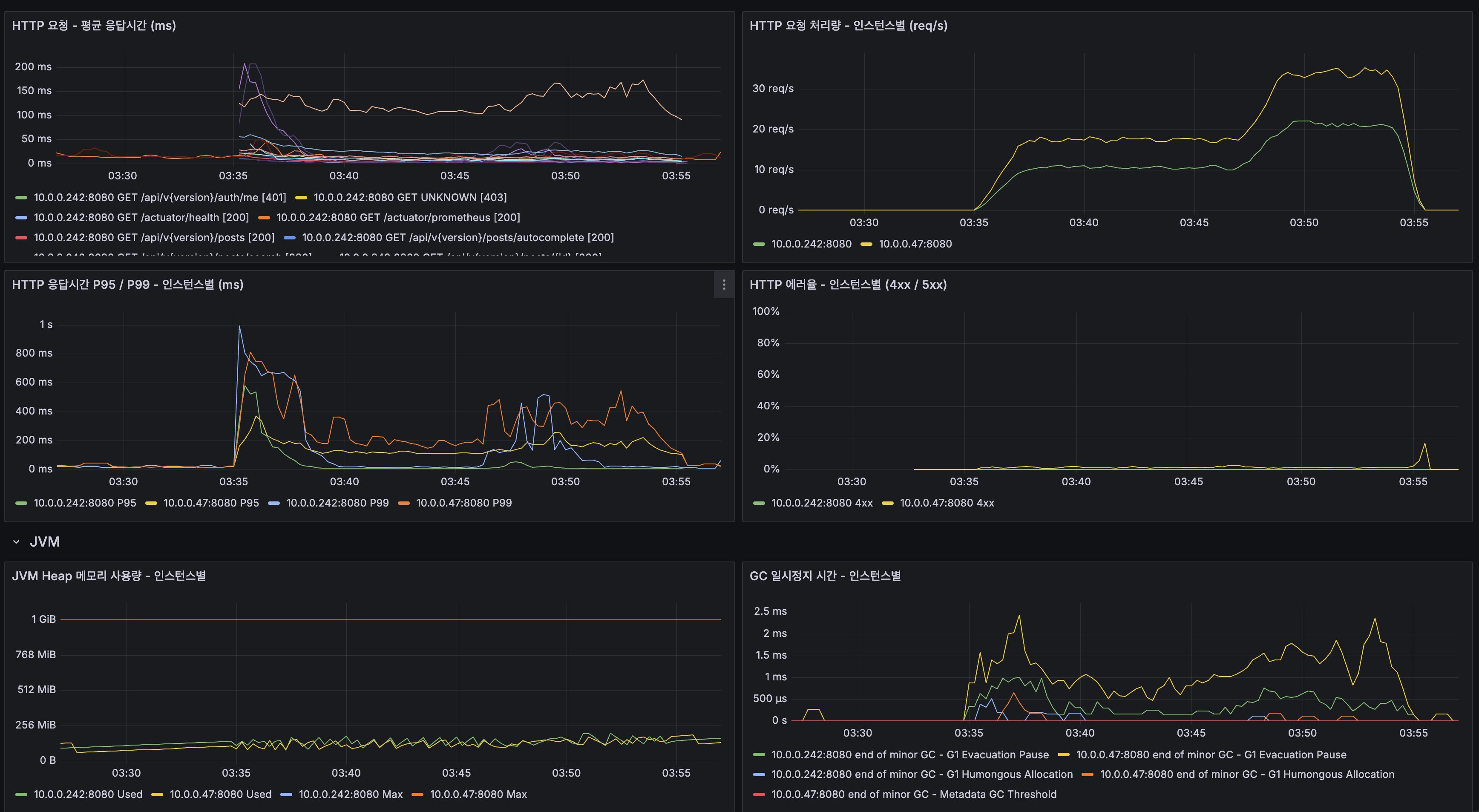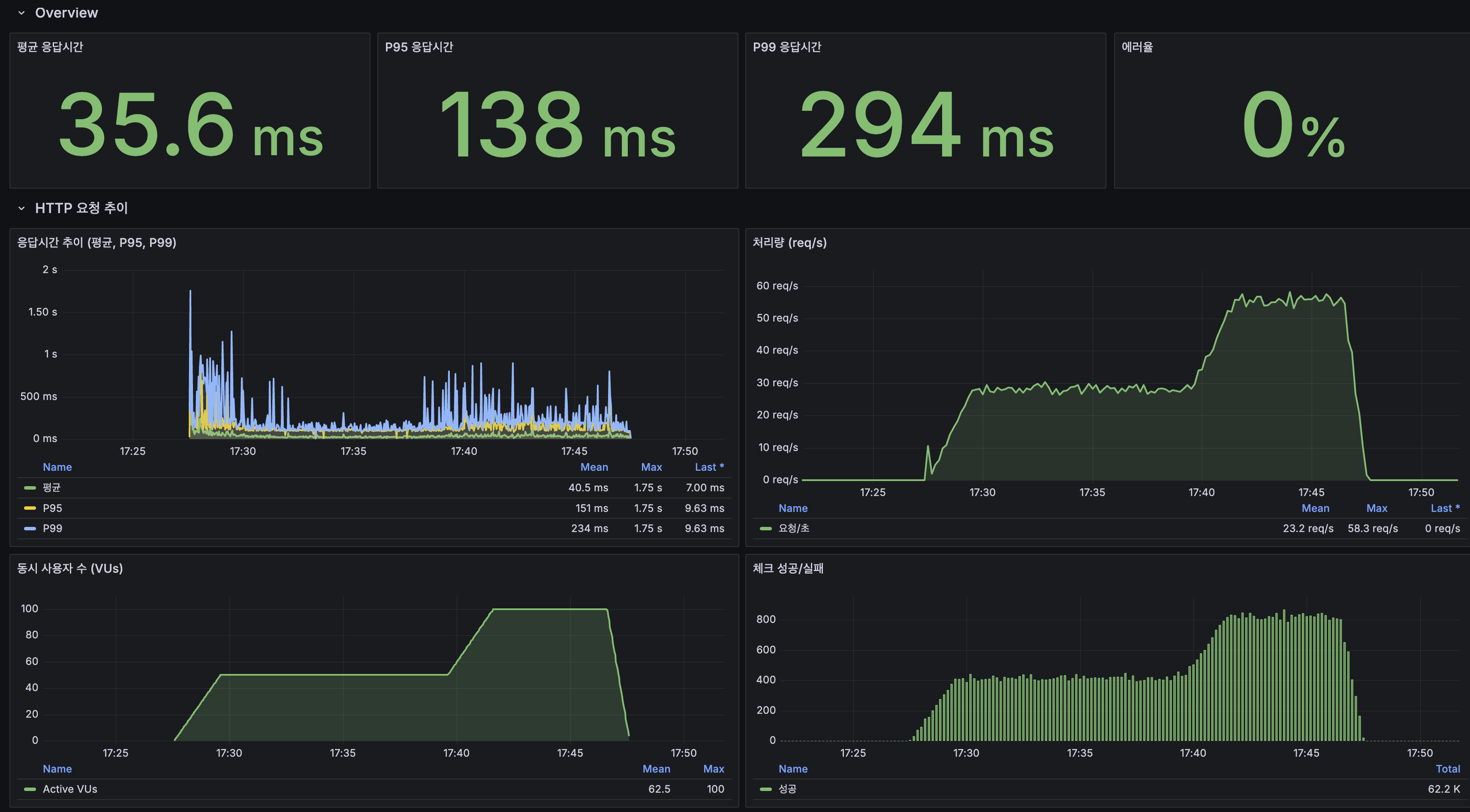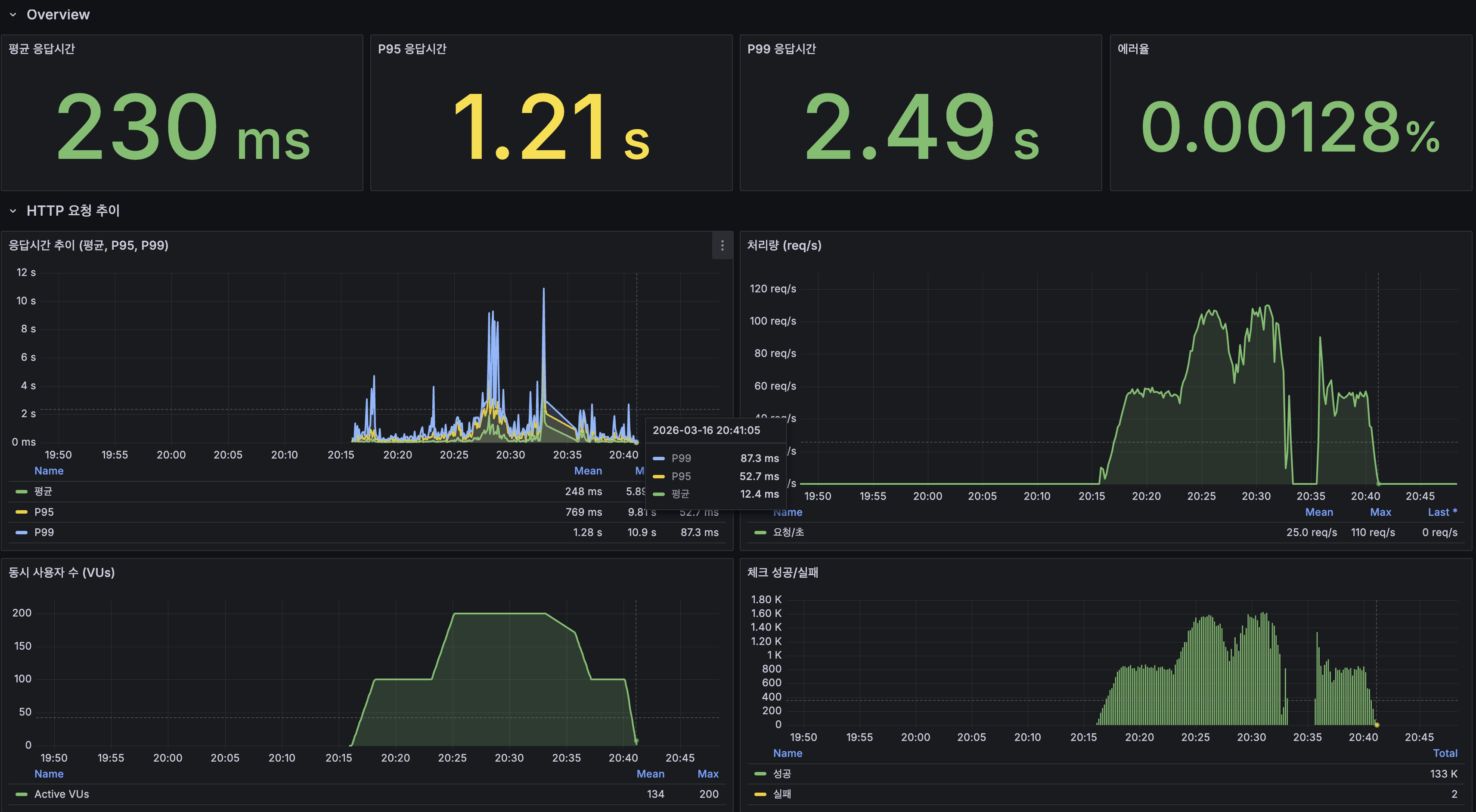 단일 서버에서 100-150 VU가 한계였던 시스템을 분산 아키텍처(2 App + MySQL Replication + Redis 3샤드 + Kafka CDC)로 전환한 후, stress 테스트(200 VU, 25분)로 한계점을 재탐색합니다. 100 VU에서 P95 200ms(SLA 충족), 200 VU에서 에러율 0.09%(단일 서버 13.25% → 0.09%), 처리량 109 req/s(3.6배↑). App CPU가 여전히 근본 병목임을 소거법으로 확인하고, MySQL/Redis/Kafka/Nginx 모두 여유임을 실측합니다.