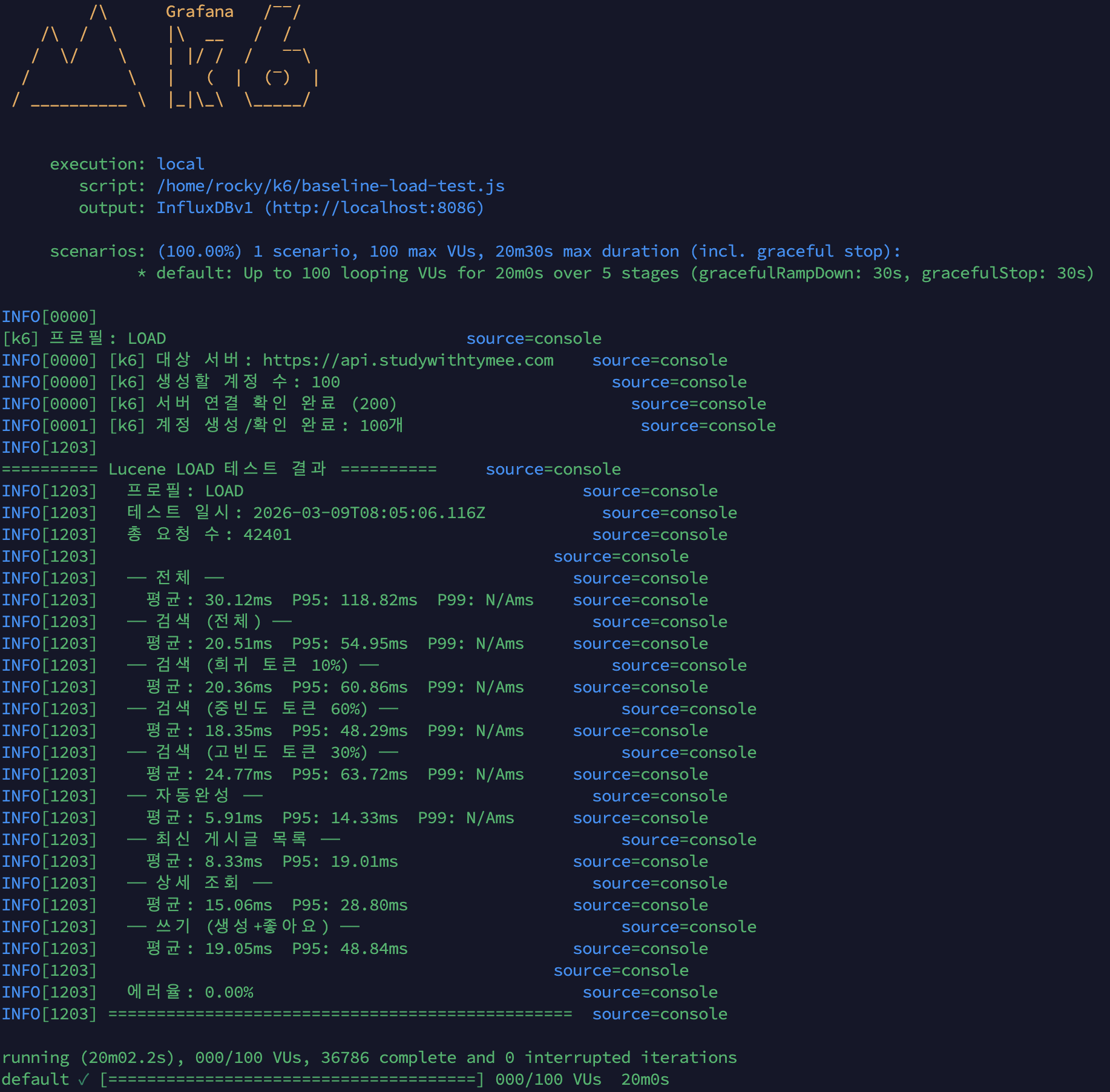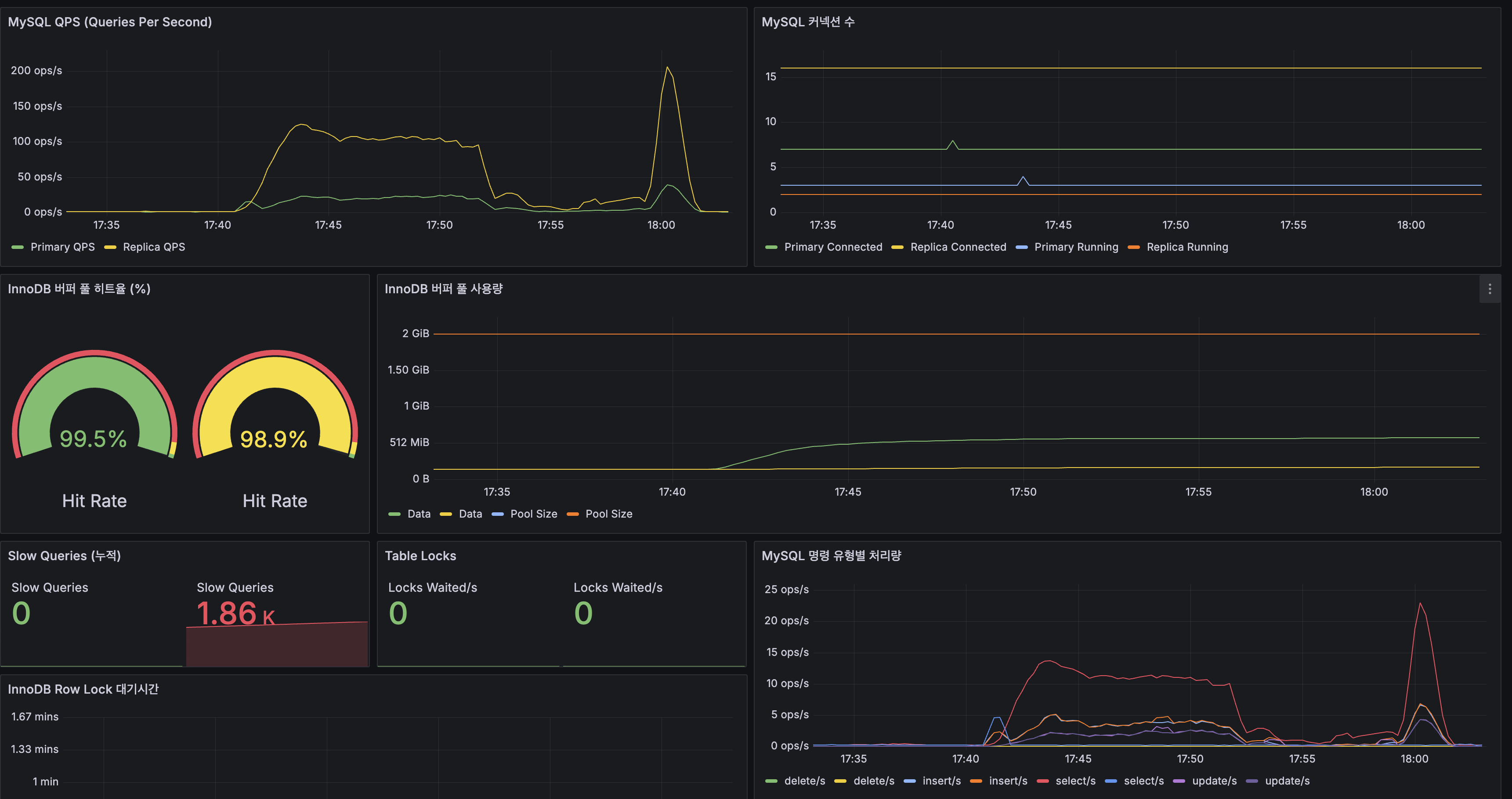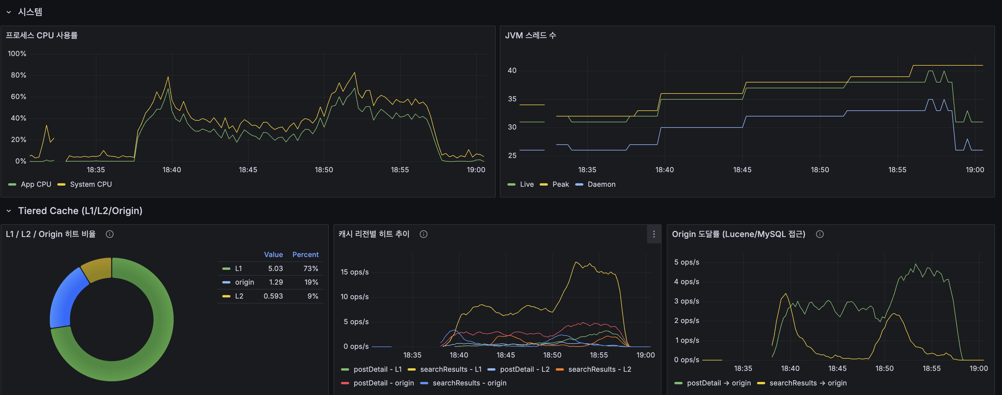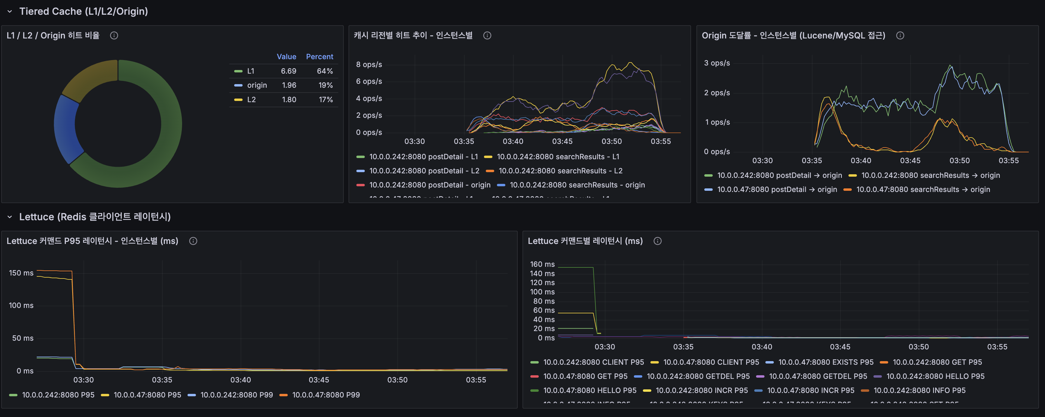 단일 서버에서 100-150 VU가 한계였던 시스템을 분산 아키텍처(2 App + MySQL Replication + Redis 3샤드 + Kafka CDC)로 전환한 후, stress 테스트(200 VU, 25분)로 한계점을 재탐색합니다. 100 VU에서 P95 200ms(SLA 충족), 200 VU에서 에러율 0.09%(단일 서버 13.25% → 0.09%), 처리량 109 req/s(3.6배↑). App CPU가 여전히 근본 병목임을 소거법으로 확인하고, MySQL/Redis/Kafka/Nginx 모두 여유임을 실측합니다.